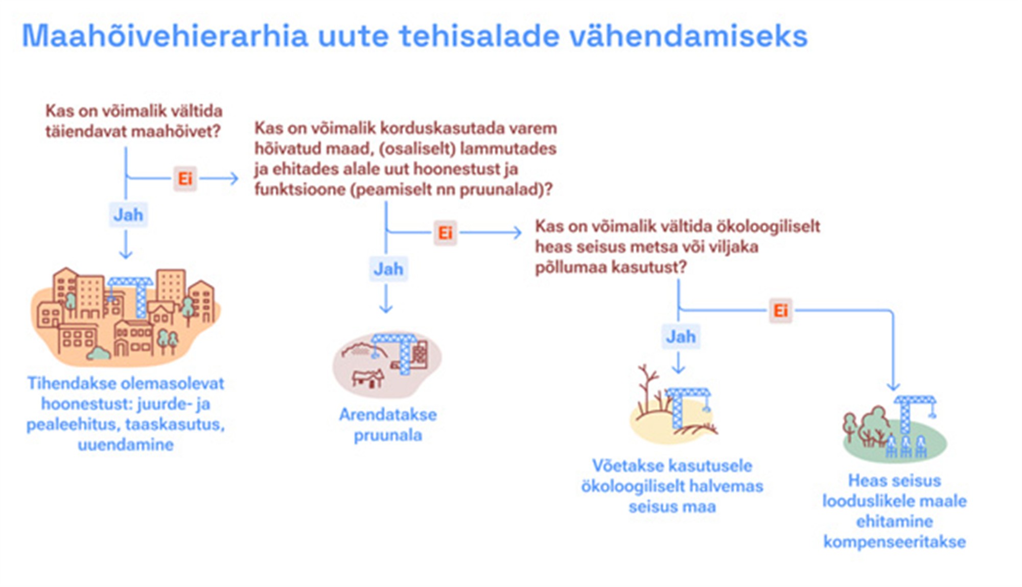 Teine planeeringu aluspõhimõte on maahõive hierarhia teekaart uute tehisalade vähendamiseks. See tähendab, et uute arendusalade rajamisel välditakse loodusliku maapinna katmist tehismaterjalidega. Selles osas on üleriigiline planeering kõige selgema väljendusega ja seepärast ka realiseeritav. Linnaarenduses peaks esimene valik alati olema olemasoleva hoonestuse tihendamine. Kui see pole võimalik, siis tuleb korduskasutada juba hõivatud maad, selektiivselt lammutada ja uusehitisi püstitada. Hea näide sellest on endiste tööstusalade arendused, Tallinnas näiteks Põhjala ja Telliskivi, Tartus Aparaaditehas. Kolmanda valikuna tuleks eelistada arendust maal, mis pole heas seisus metsamaa ega viljakas põllumaa. Viimase variandina, kui heas seisus looduslikule maale ehitamine on vältimatu, tuleb tekkiv keskkonnakahju mujal kompenseerida. Sääraste selgete teekaartide najal töötatakse välja toetavad reeglid, seadused ja planeerimispraktika, mille mõju on mõõdetav.
