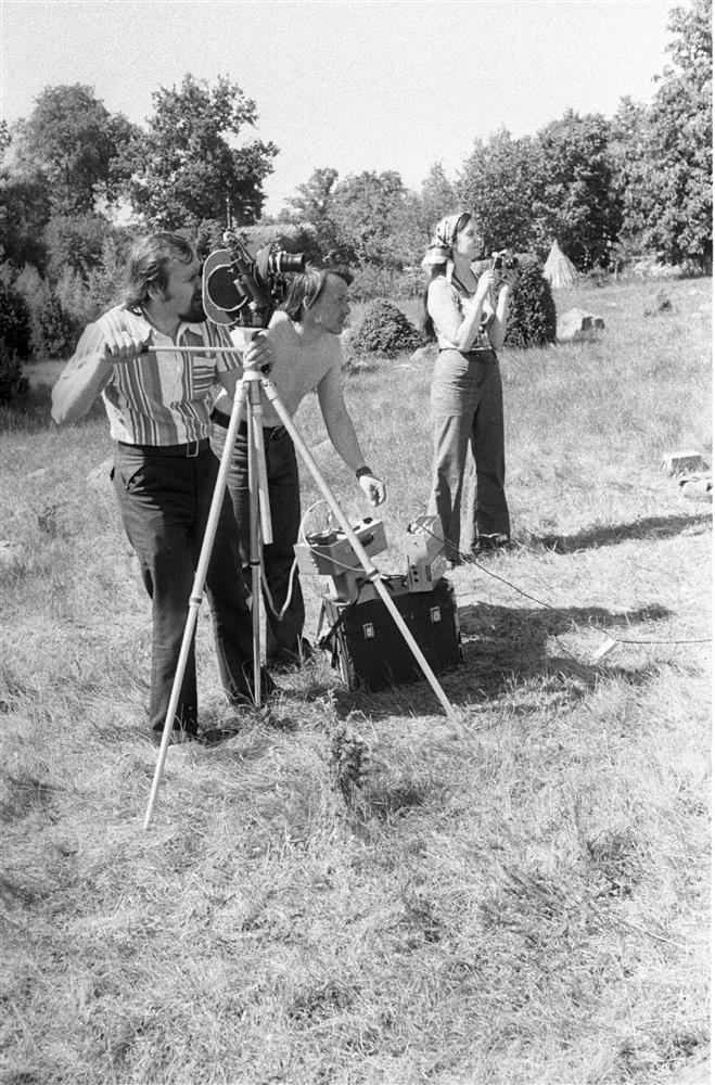 Laulumängu filmimine Muhumaal. Seisavad (vasakult) Vello Ojanurme, Olav Kiis ja Ingrid Rüütel.