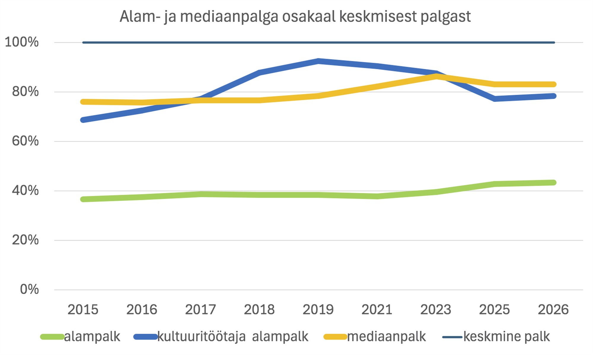 See ei tähenda, et andmeid üldse olemas ei oleks. Arengukavas lubatud uuringuid on tehtud ja riigil on andmeid mujaltki lahedalt käes. Iseasi, kas neid vaatama ja võrdlema peaksid teadlased kalli raha eest või võiksid ministeeriumi ametnikud selle töö ise ära teha. Näiteks vaarao unenäo täpsuse illustreerimiseks kulus mul kümmekond minutit (vt joonis). Arengukava tegevussuuna „Tugev ja toimiv kultuurielu“ punkt 1.2 kõlab: „Parandame kultuuritöötajate töö- ja palgatingimusi. Kultuurivaldkonnas tegutsevas riigi hallatavas asutuses, riigi asutatud sihtasutuses ning avalik-õiguslikus asutuses on eesmärgiks tagada kvaliteetsed ja konkurentsivõimelised töötingimused võrreldes üldise tööjõuturuga, sh tagada vastavad eelarvelised vahendid palgatingimuste konkurentsivõime hoidmiseks Eesti keskmise palga suhtes.“ Nagu jooniselt näha, ei ole konkurentsivõimet hoitud: kõrgharidusega kultuuritöötaja alampalk moodustab aina väiksema osa üldisest keskmisest. Langus kestab seitsmendat aastat ja juba kolme aasta eest pudenes see alampalk allapoole mediaani. 2026. aasta andmed on alles oletuslikud, aga kui ühiskonnal-majandusel üldiselt peaks prognoosist paremini minema, tähendab see, et fikseeritud palk näeb suhtarvuna veelgi nigelam välja. Pilt peaks ka rahandusministrile andma veenva selgituse, miks ühes eluvaldkonnas tegutsejate meeleolu lakkamatult langeb.
