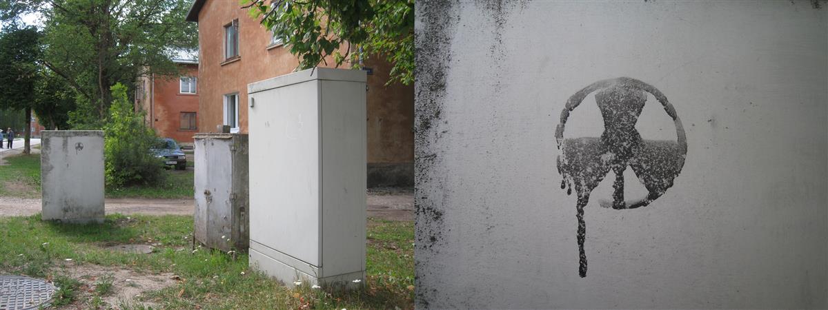 Pika ja Petseri tänava nurgal on hauakive meenutav kilpide kolmik, ühel neist radioaktiivsusmärk.
