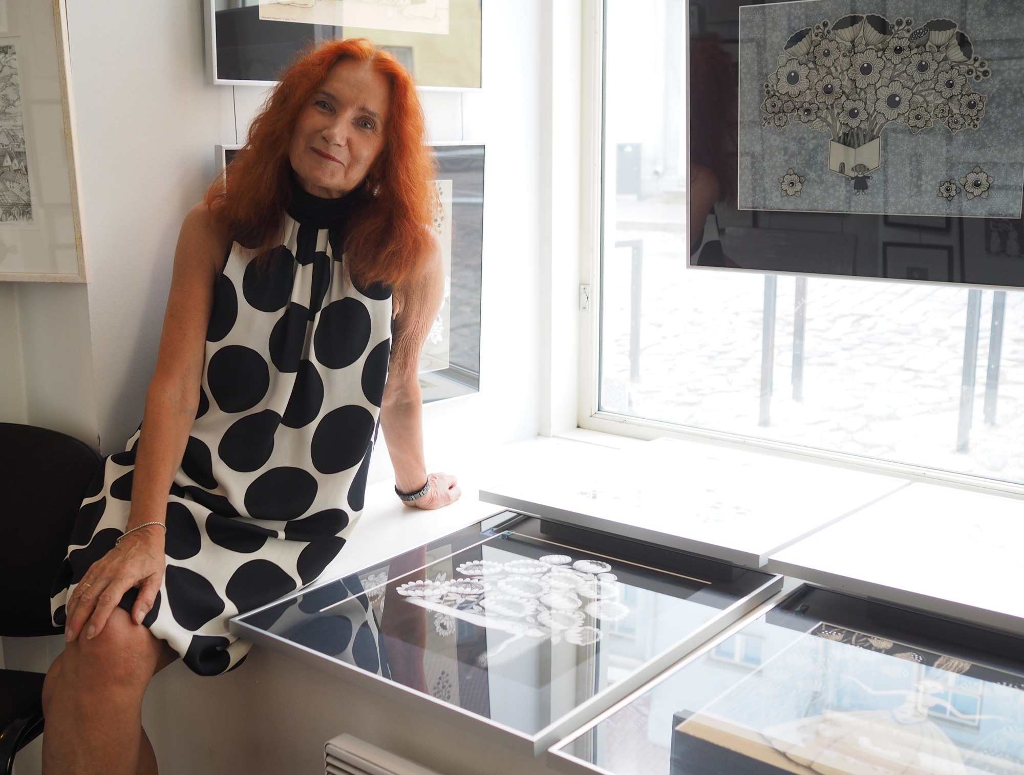 Tarbekunstigalerii „Kunstiaken“ näituseaknal on graafik Viive Noore näitus „Unenägude aed“