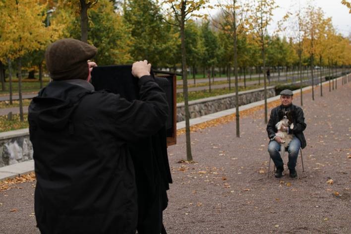 Loomerahva plaatkaameraga pildistamine võimaldas Toomas Kalvel kogeda, kui tohutult erinevad võivad olla inimnatuurid. Näiteks Peeter Volkonski ülesvõte tehti tema hämaravõitu kabinetis, kus vähese valguse tõttu venis säriaeg 7–8 sekundi pikkuseks. Just nii pika aja pidi modell täiesti liikumatuna püsima. Kui veini rüübanud Volkonskile seda olukorda selgitati, rahustas vürst: „Ole rahulik, ma olen õppinud näitleja, ma tean, mida tähendab olla liikumatult.“ Ja Volkonski ei vedanud alt. Tema silma pealt on võimalik kaamera peegeldust näha. Risti vastupidi läks Contra ülesvõtmisega päikeselisel suvepäeval, mil valgust küllalt ja säriaeg lühike. Luuletajal paluti kõigest üks sekund paigal püsida, kuid selgus, et see oli püsimatule Contrale ületamatult pikk aeg. Portreede näitusel on Contra nägu seetõttu ka kõige udusem. Isegi kass ja koer samal pildil tulid teravamalt välja! „Sekund on ikka väga pikk aeg,“ sõnas Kalve.
