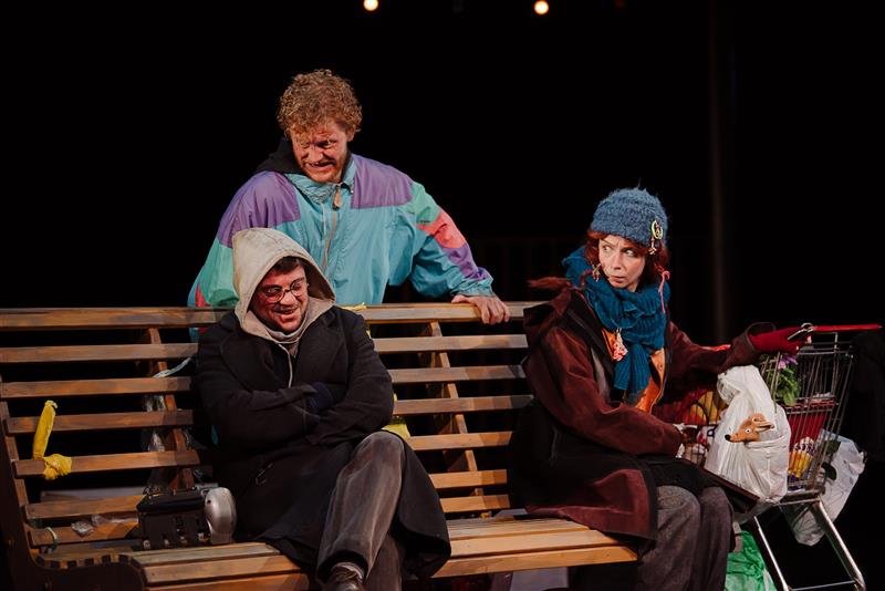 Need kolm tegelast peaksid moodustama näidendi ja lavastuse dünaamilise, konflikte ärgitava selgroo. Eks nad moodustavadki. Eriti särava rolli teeb Markus Habakukk, kelle punase näoga intensiivne joodik on lollust täis peaga, dünaamilise kehakeelega, aga mitte üle mängitud, seega täiesti usutav kodutu. Ka Gansen kähedahäälse intelligentse kunstnikuna on veenev: ilmselgelt ta ei sobitu sinna keskkonda ning teda ajavad hulluks kaaslaste lollid küsimused ja materialistlik eluvaade. Lauli Otsaril on vahest kõige keerulisem ülesanne, millega ta üpris mänglevalt hakkama saab: tema Anita on pooleldi segase vaimuseisuga, traumaatiliste kogemustega plähmerdis, seejuures aimub temast õrnust ja haavatavust. Kõik kolm näitlejat saavad üldjoontes luua midagi oma varasemast näitlejapagasist erinevat. Nii et kõik peaks justkui hästi olema. Aga sellest jääb teatris väheks.